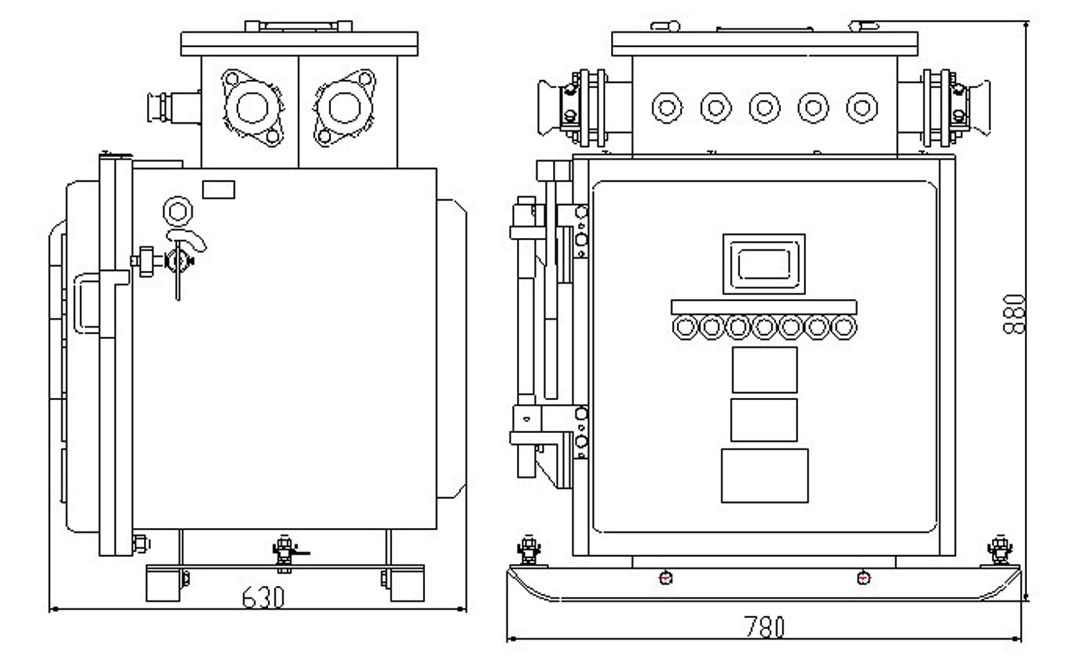 綜合裝置由隔爆外殼、主變壓器和控制部分等組成。隔爆外殼為方形,殼蓋與殼身采用滑動止口結(jié)構(gòu),開啟方便。外殼上部的接線箱作為引進(jìn)和引出電纜用,外殼右側(cè)裝有操作組合開關(guān)的手柄,并有可靠的機(jī)械聯(lián)鎖裝置,門蓋上裝有控制按鈕和試驗(yàn)按鈕,門蓋上有一觀察窗,可以從外面觀察到裝置里面液晶漢顯顯示屏的指示狀態(tài)。殼體內(nèi)的控制部分由控制器件板和真空交流接觸器板組成。在控制器件板上裝有微電腦控制器、液晶顯示屏、電流取樣板、電流傳感器、濾波器、電源控制變壓器、試驗(yàn)電阻、保險等器件。真空交流接觸器板上裝有真空交流接觸器、管式熔斷器,電流互感器,三相電抗器等器件?刂破骷迮c真空交流接觸器板通過一組航空插件及連線構(gòu)成聯(lián)系。防爆外殼箱體內(nèi)裝有主變壓器。